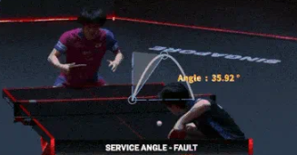 根据WTT联赛的TTR(Tennis Review 乒乓球回放系统)规定,发球轨迹夹角≤30度即为合规发球。