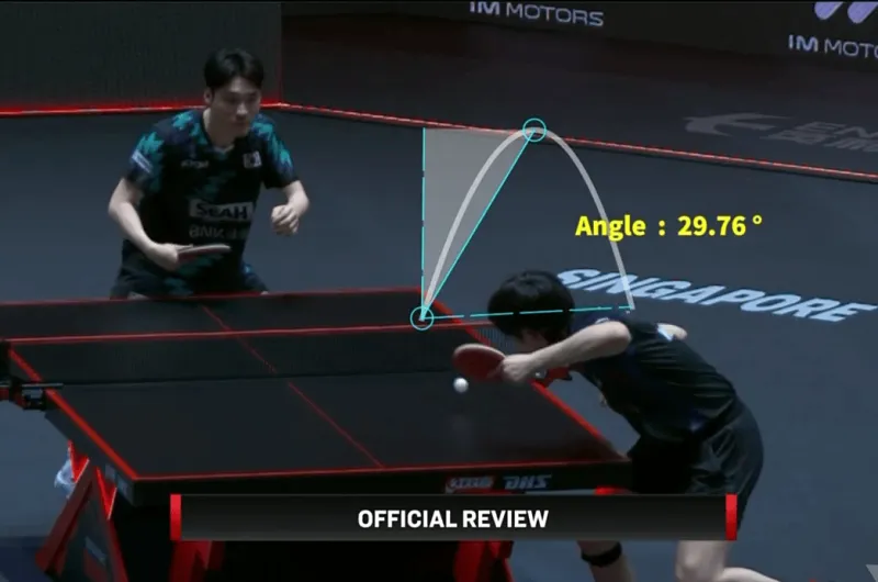 在16强赛对阵林德的第二局比赛当中,王楚钦被判回抛违例,随后他申请鹰眼回放显示25.81°,挑战成功。