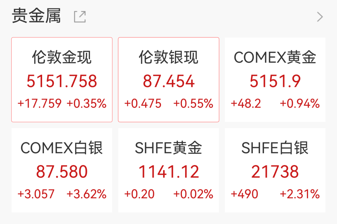 大宗商品方面,3月10日,黄金白银开盘下挫,截至北京时间7:01,均止跌回升,现货黄金涨0.35%报5151.75美元/盎司,现货白银涨0.55%报87.454美元/盎司。