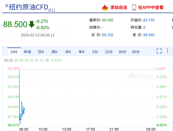 WTI原油亚洲开盘直线跳水10%至每桶85.52美元,截至北京时间6:56,WTI原油跌6.62%报88.5美元/桶。