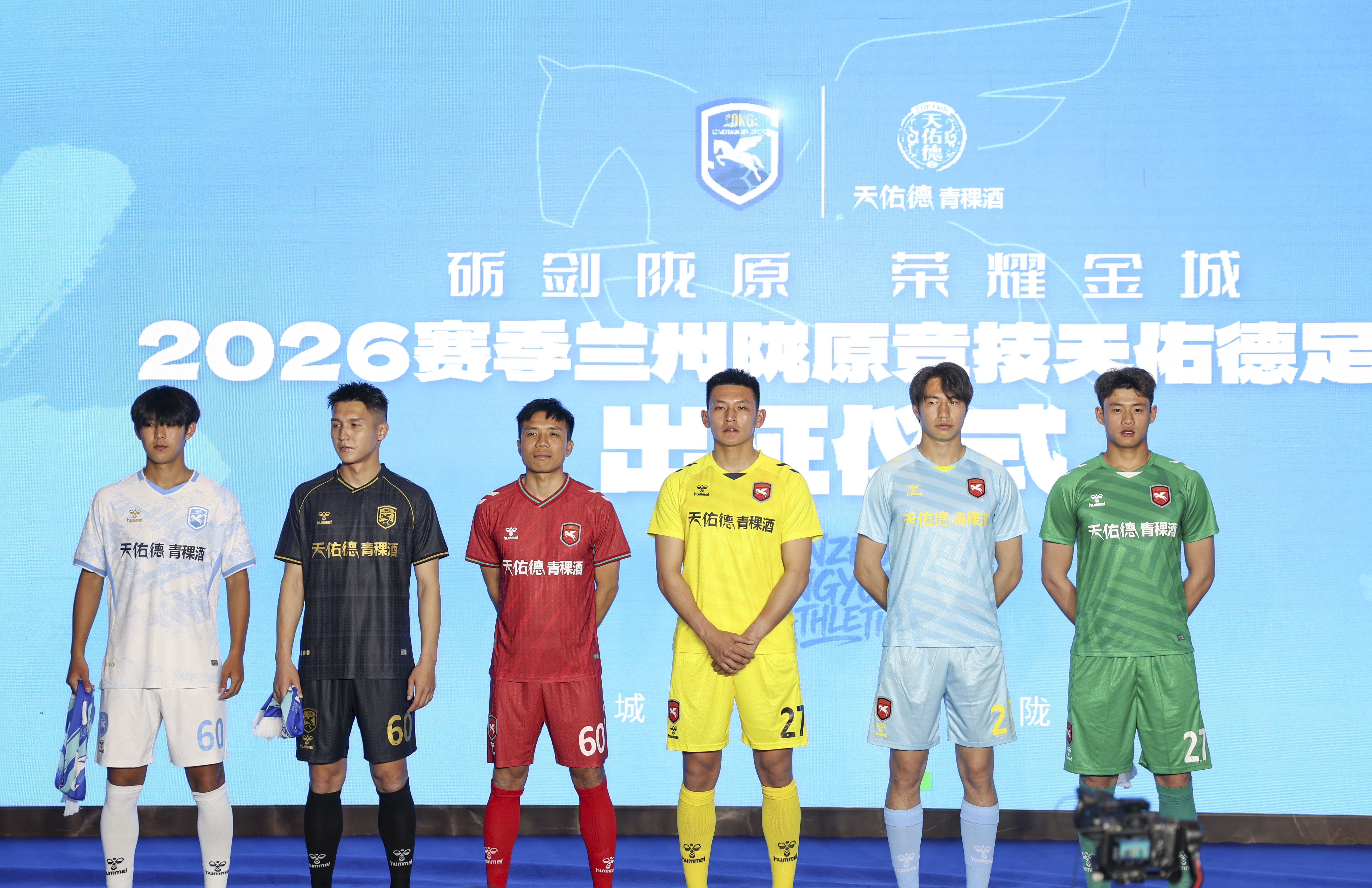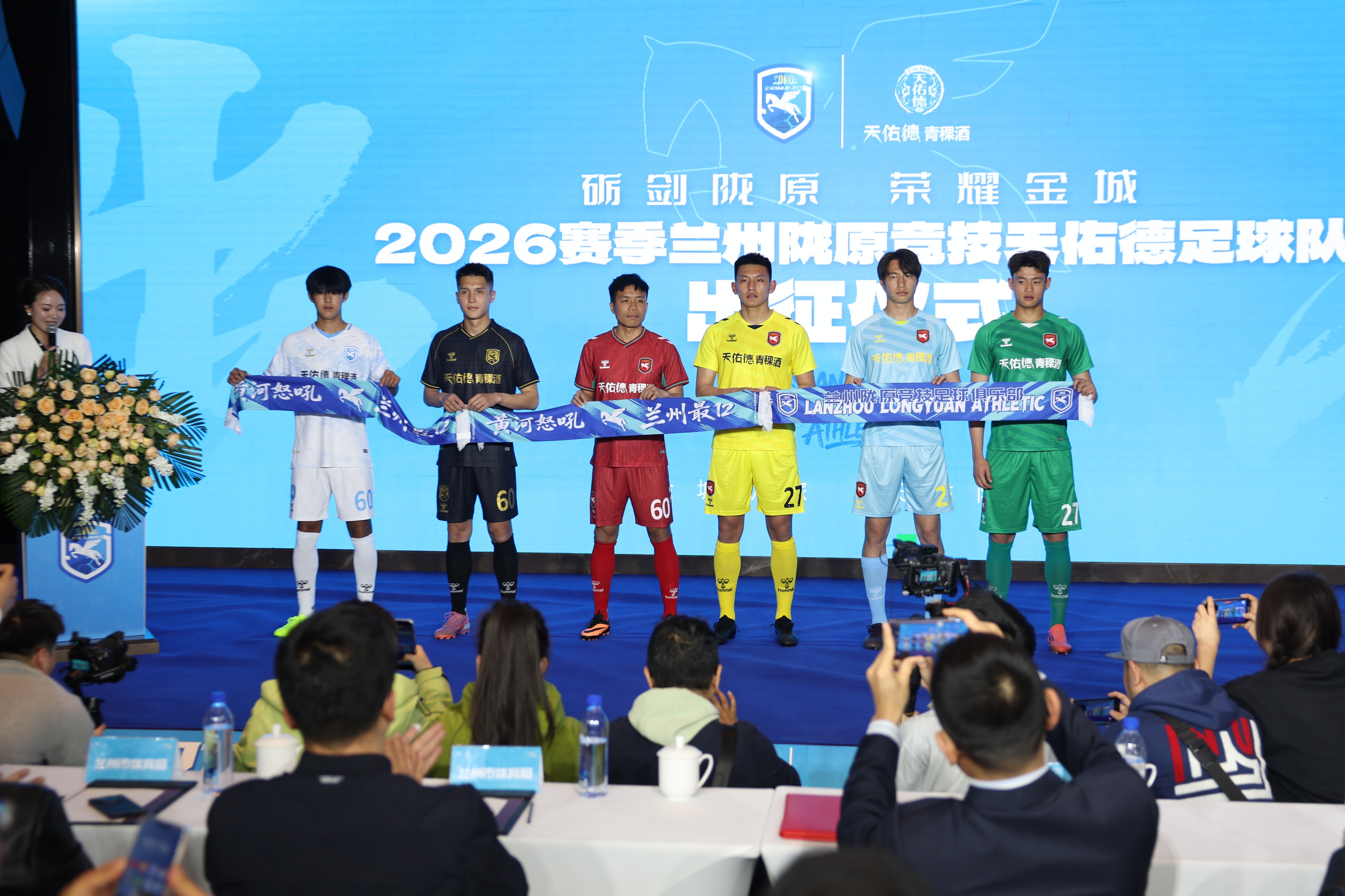 3月18日,兰州陇原竞技足球俱乐部球员在出征仪式上展示新赛季球衣。新华社记者 陈斌 摄