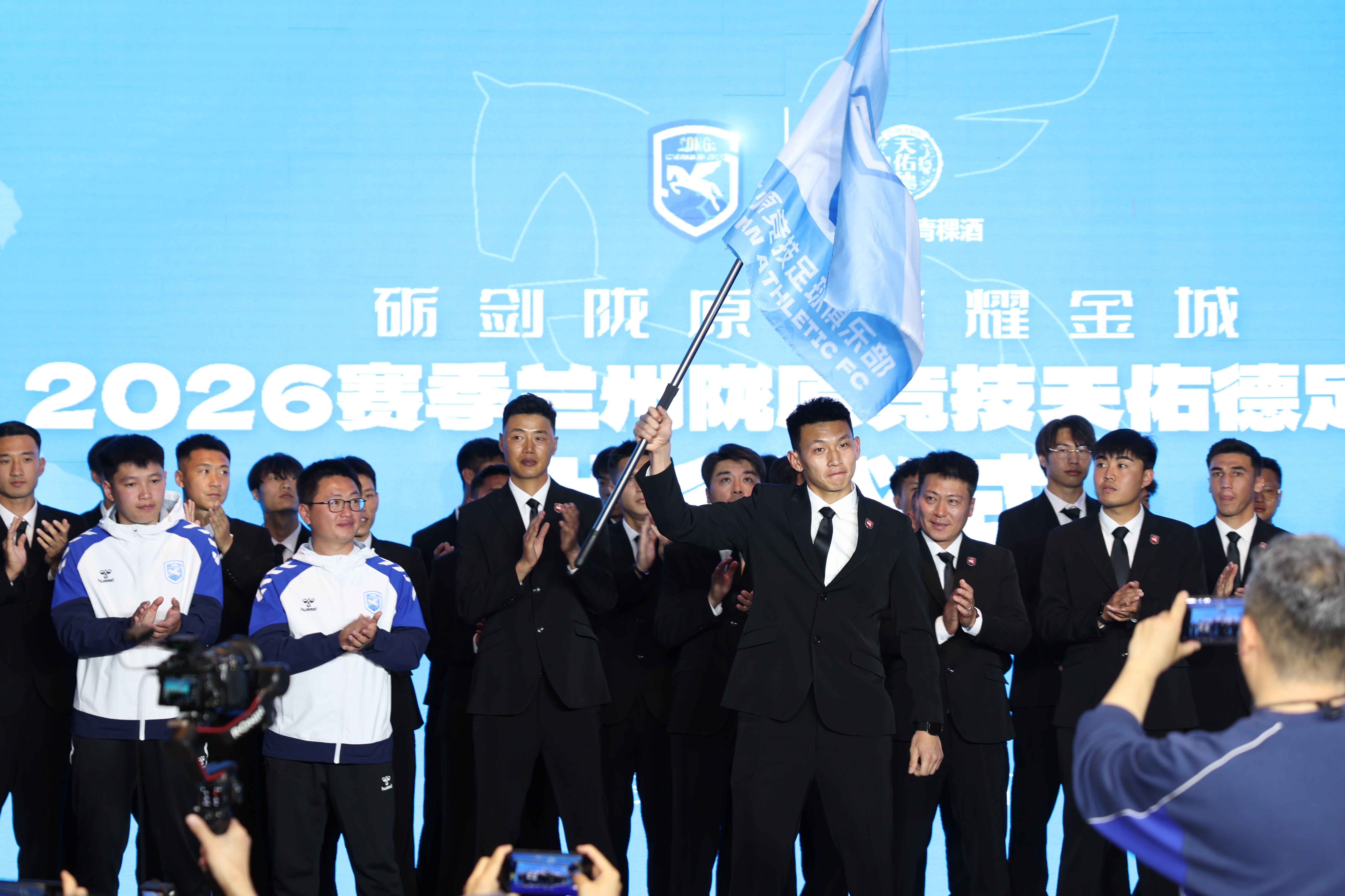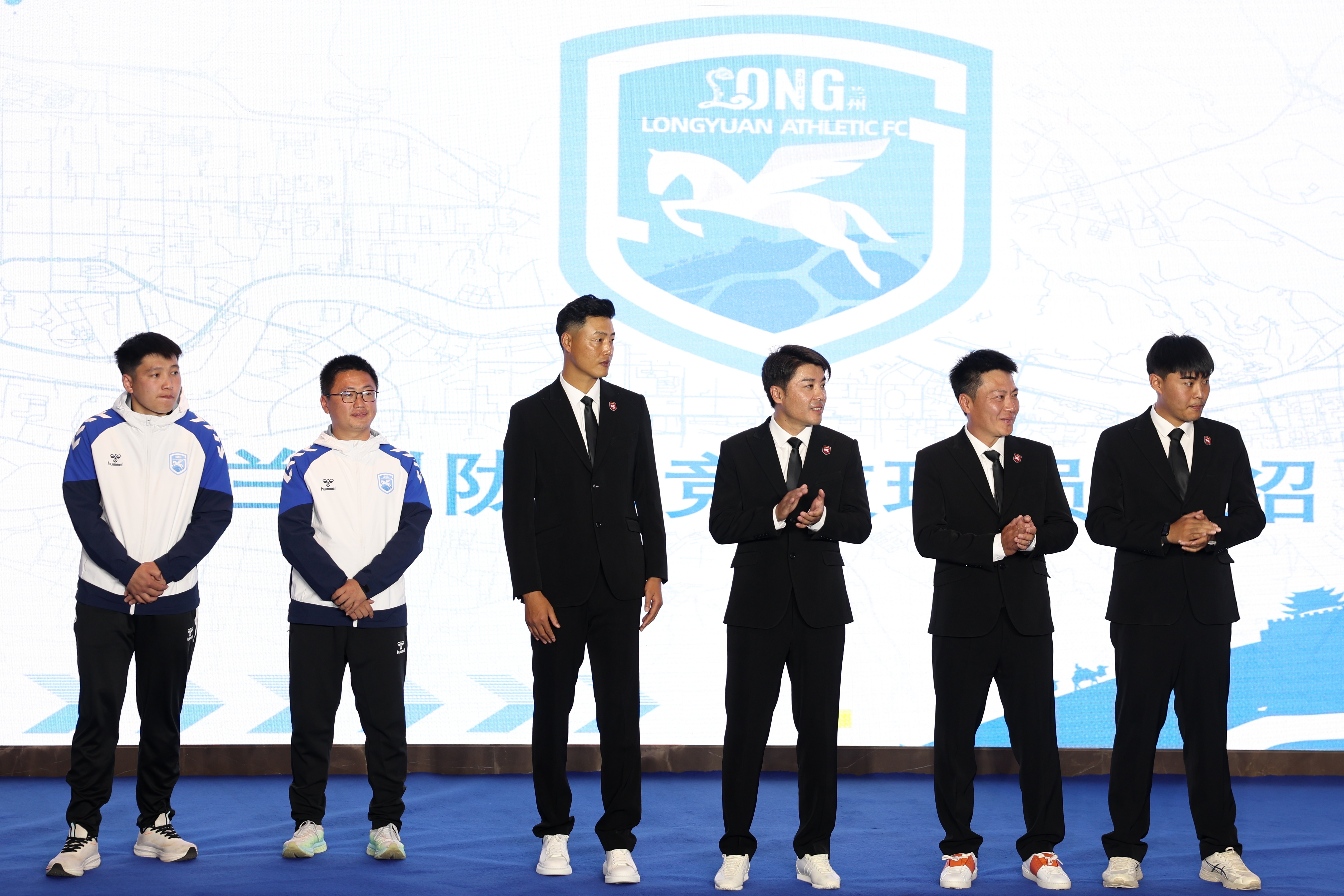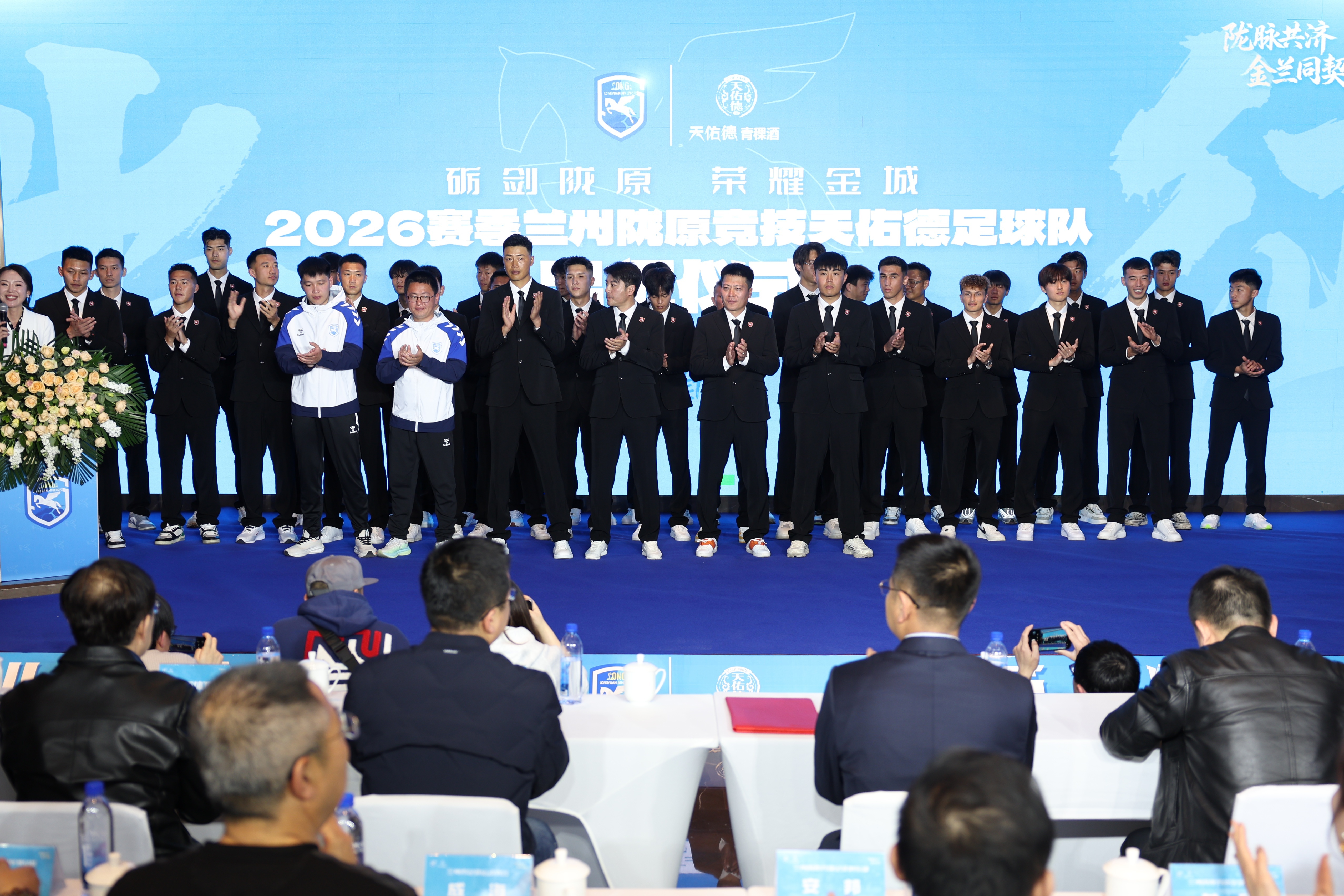 3月18日,兰州陇原竞技足球俱乐部教练组在出征仪式上亮相。新华社记者 陈斌 摄