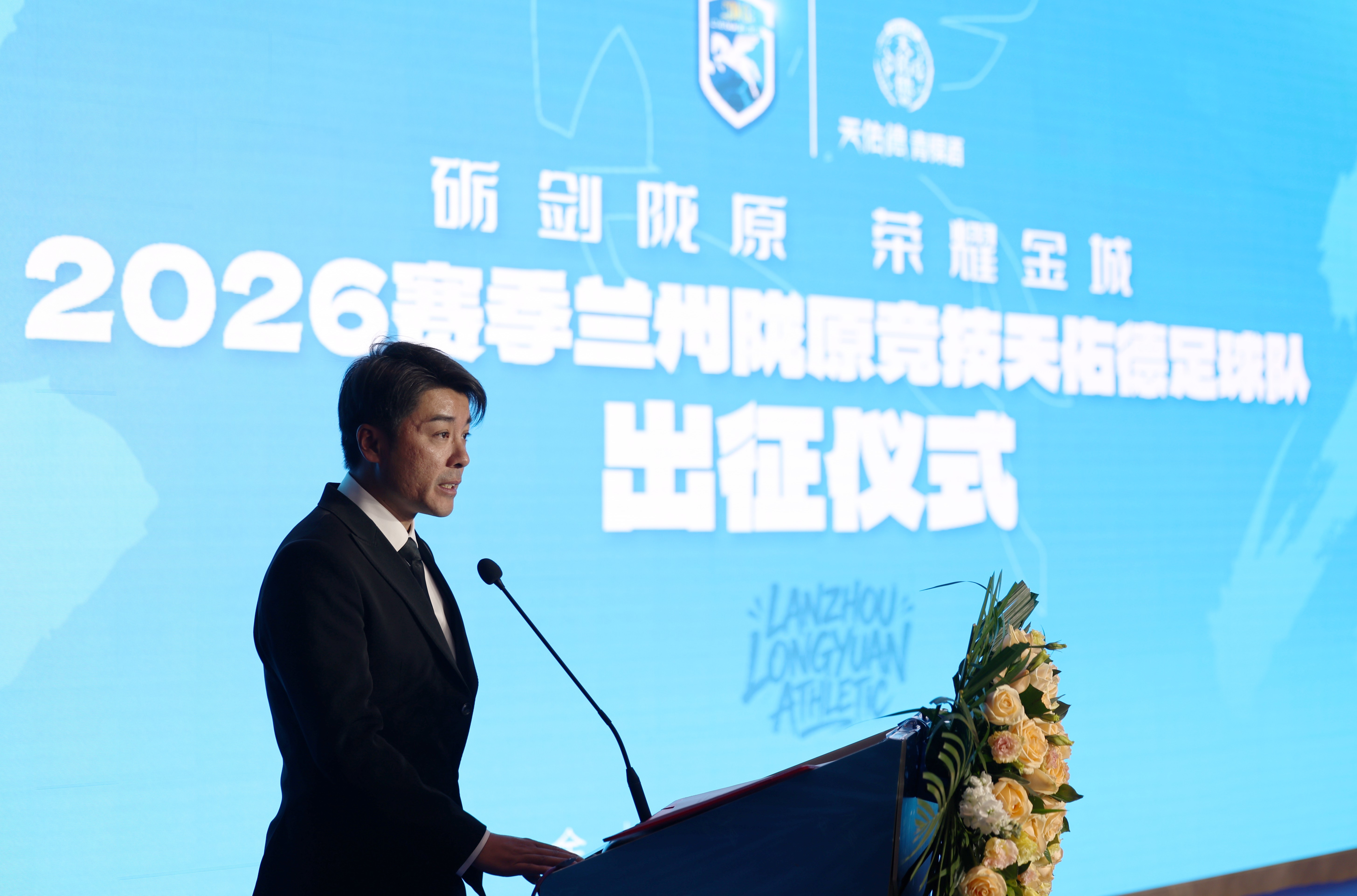 3月18日,兰州陇原竞技足球俱乐部主教练曹睿在出征仪式上致辞。新华社记者 陈斌 摄