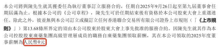由于陈杰辉作为控股股东广药集团高级管理人员自广药集团领取薪酬,其在本公司领取的2025年度董事薪酬为人民币0元。